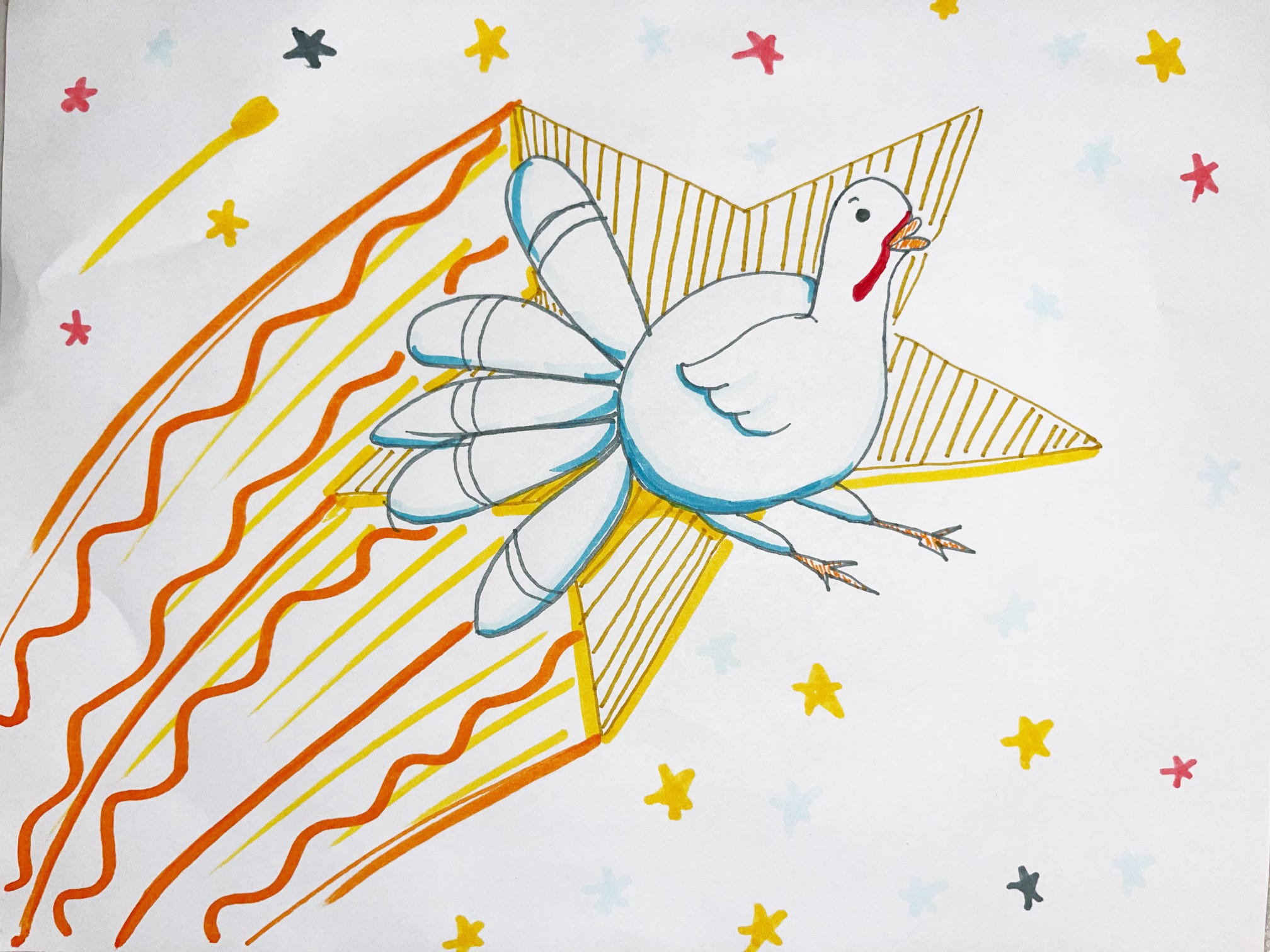 “This turkey never witnessed the sunrise. It never felt a cool breeze, the tickle of dandelions, the caress of green grass, or soft spring rain. It never drank from a cool stream of water or foraged for fruit or flapped its wings in excitement. It ate mealy-meal and broke its legs and breathed poisonous air. But, for one night, this turkey saw a night sky lit with galaxies. Deep fried to the cosmic highway, may you fly far from this world my sweet bird.”